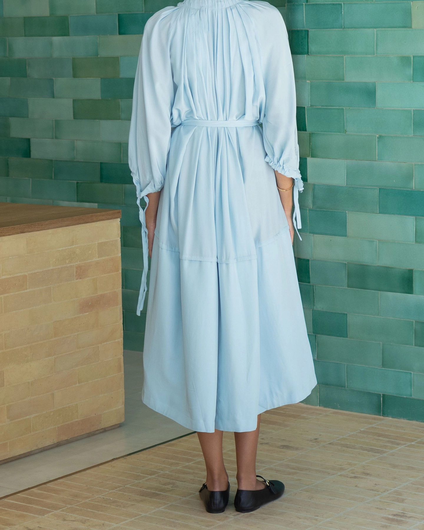 A silky viscose blouson dress that lays close to the body. Featuring generous box pleats self ties at sleeve, and a placket with hidden horn buttons that goes all the way down to hem. Bright blue color makes it a great choice for celebrations.