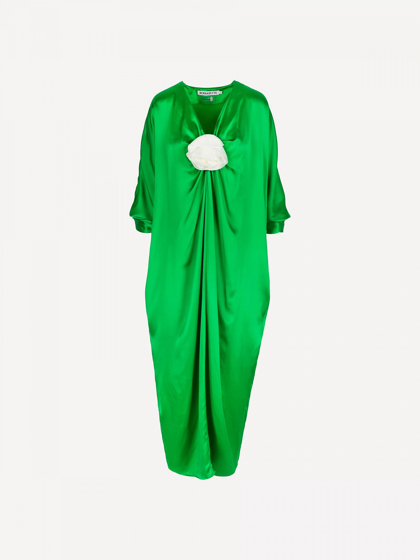 Experience the luxury of silk satin in Dress Gilles. With a vibrant emerald green color and finished with a white rosette, this dress is perfect for summer nights. The relaxed fit offers comfort while the v-neck and feminine rosette adds a touch of glamour.