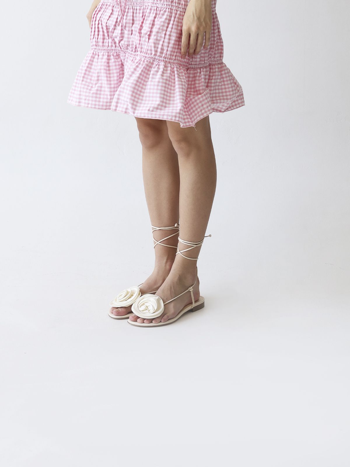 WRAP AROUND FLAT FLOWER SANDALS SATIN CREAM