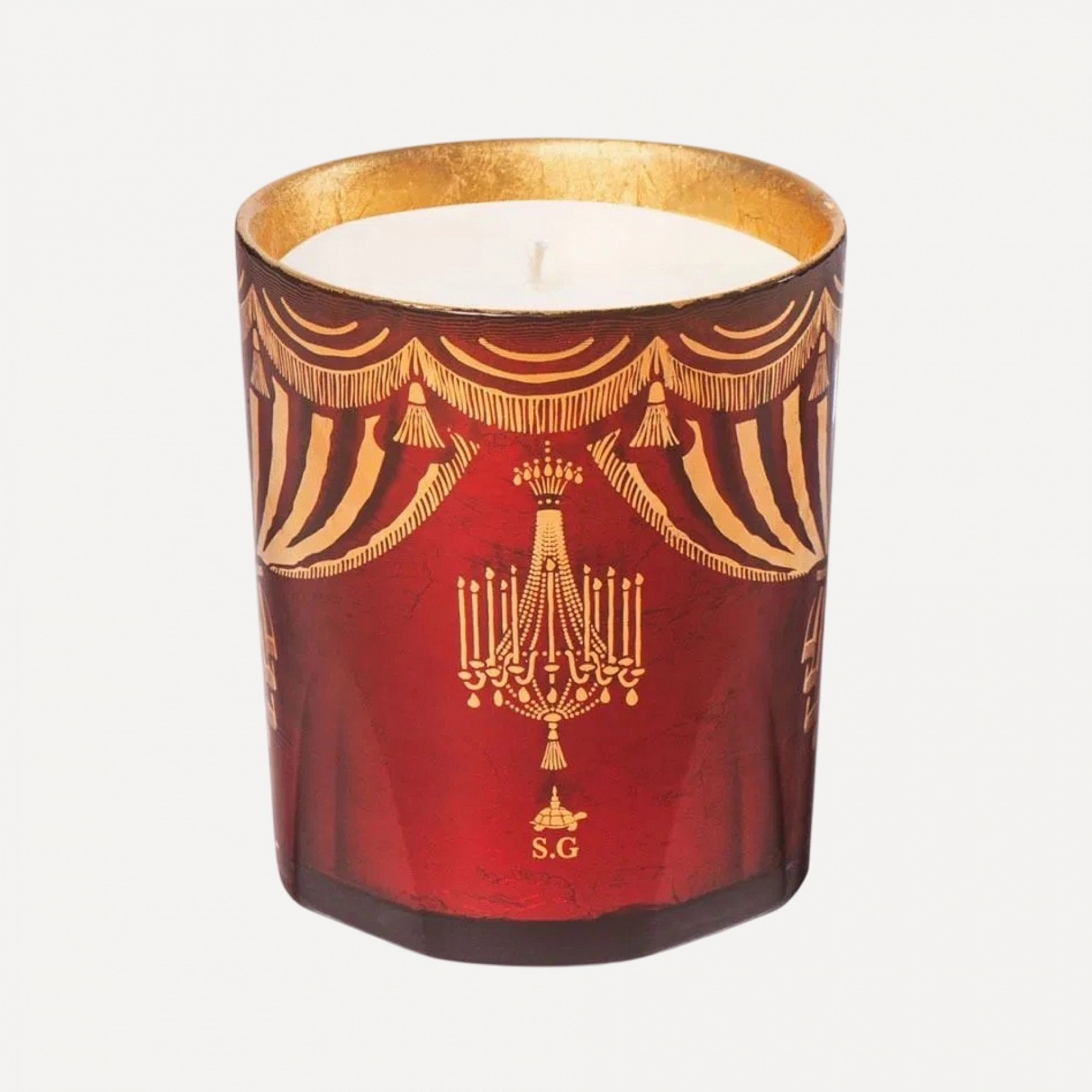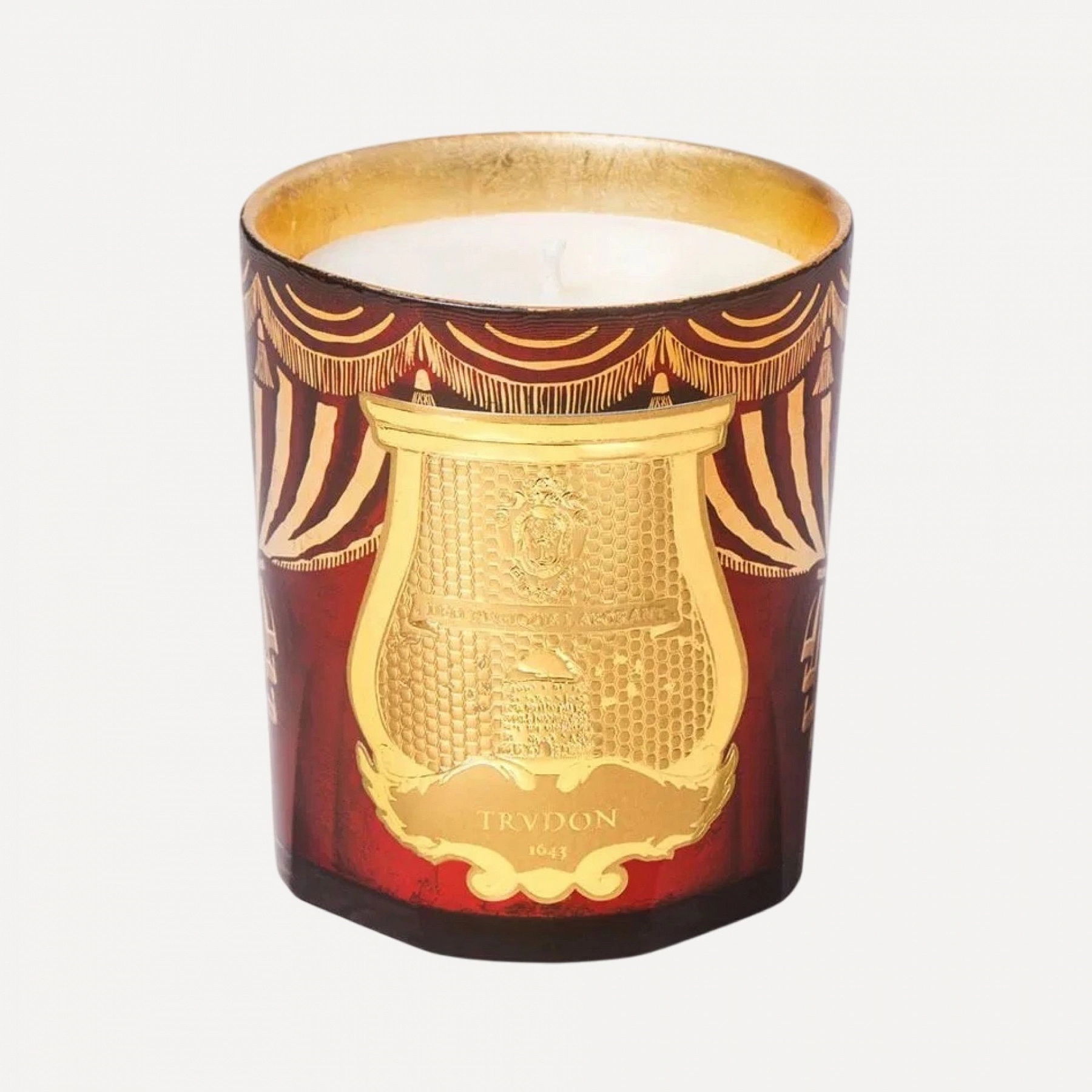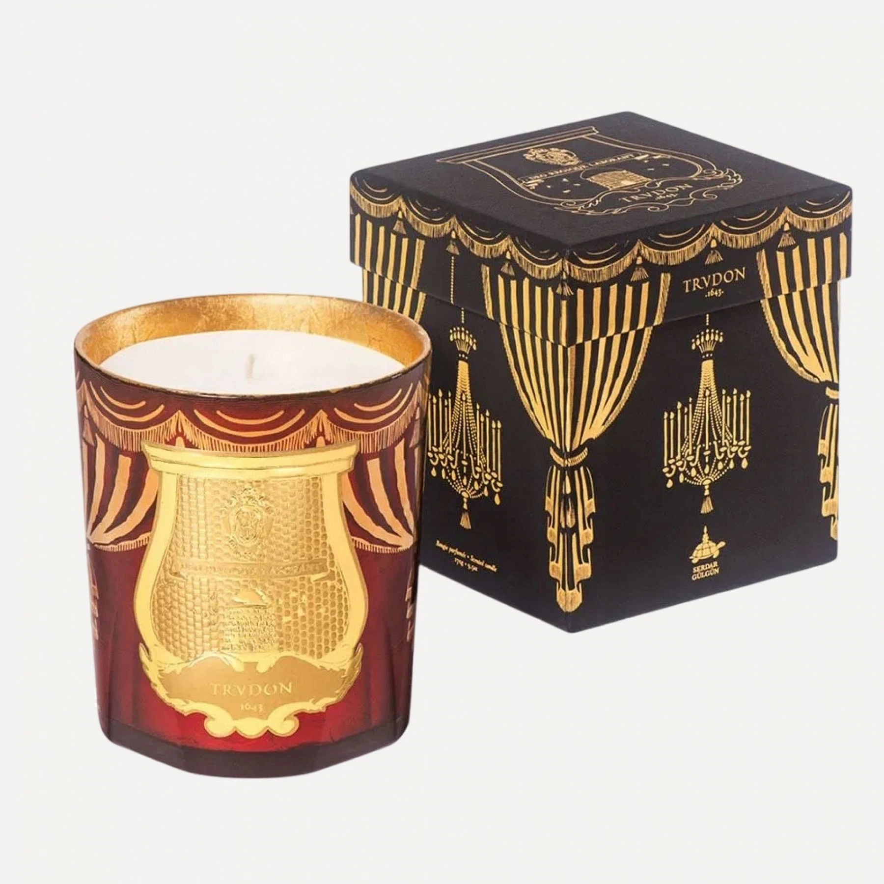 For Christmas, Trudon builds on the opulence of Versailles: more, it revives the balls and masquerades once held by Louis XV at the Château. At the heart of the festivities, anything becomes possible. On the inside, it is covered in 24-carat gold leaf, while on the outside, a royal décor comes to life with stylized chandeliers, pendants and curtains. Marked in hot gold, the decorations frame the gold coat of arms of the Royal Manufactory. On the back of the candle, a decorative chandelier hangs over Serdar Gülgün's signature. Gloria is a warm and woody fragrance blended with spicy notes.