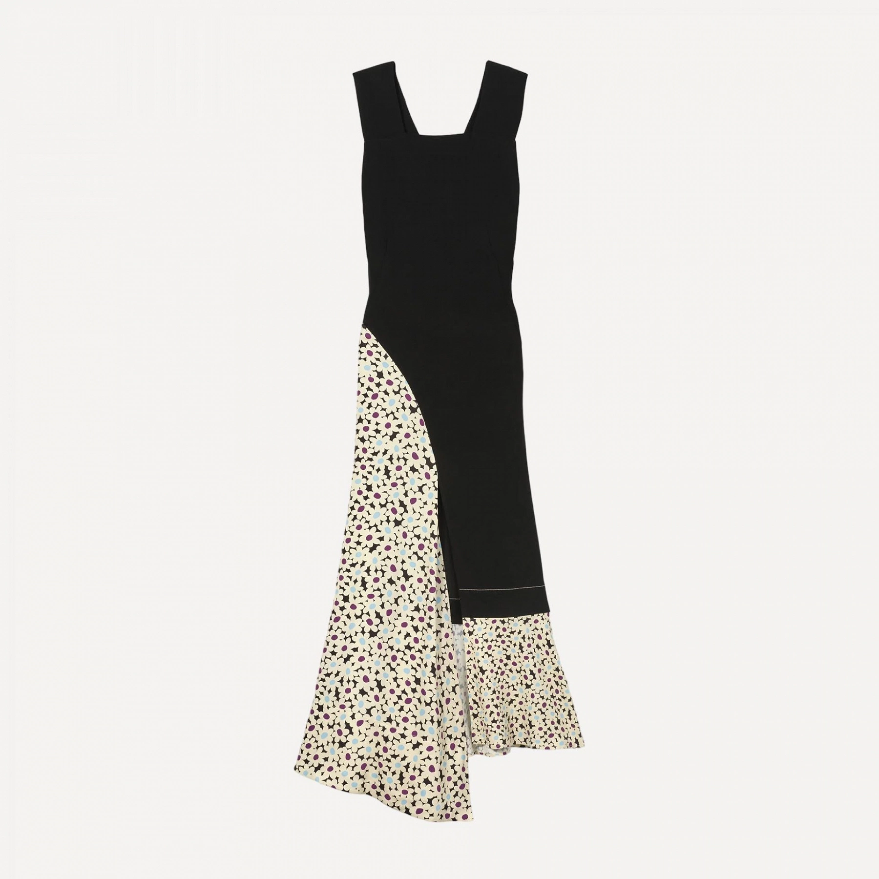 Sleeveless dress with a square neckline, and wide shoulder straps that crisscross in the back. Floral print patchwork seamlessly blends with the sophistication of solid black crepe. Backless. Invisible zipper on side seam. Fabric covered buttons.