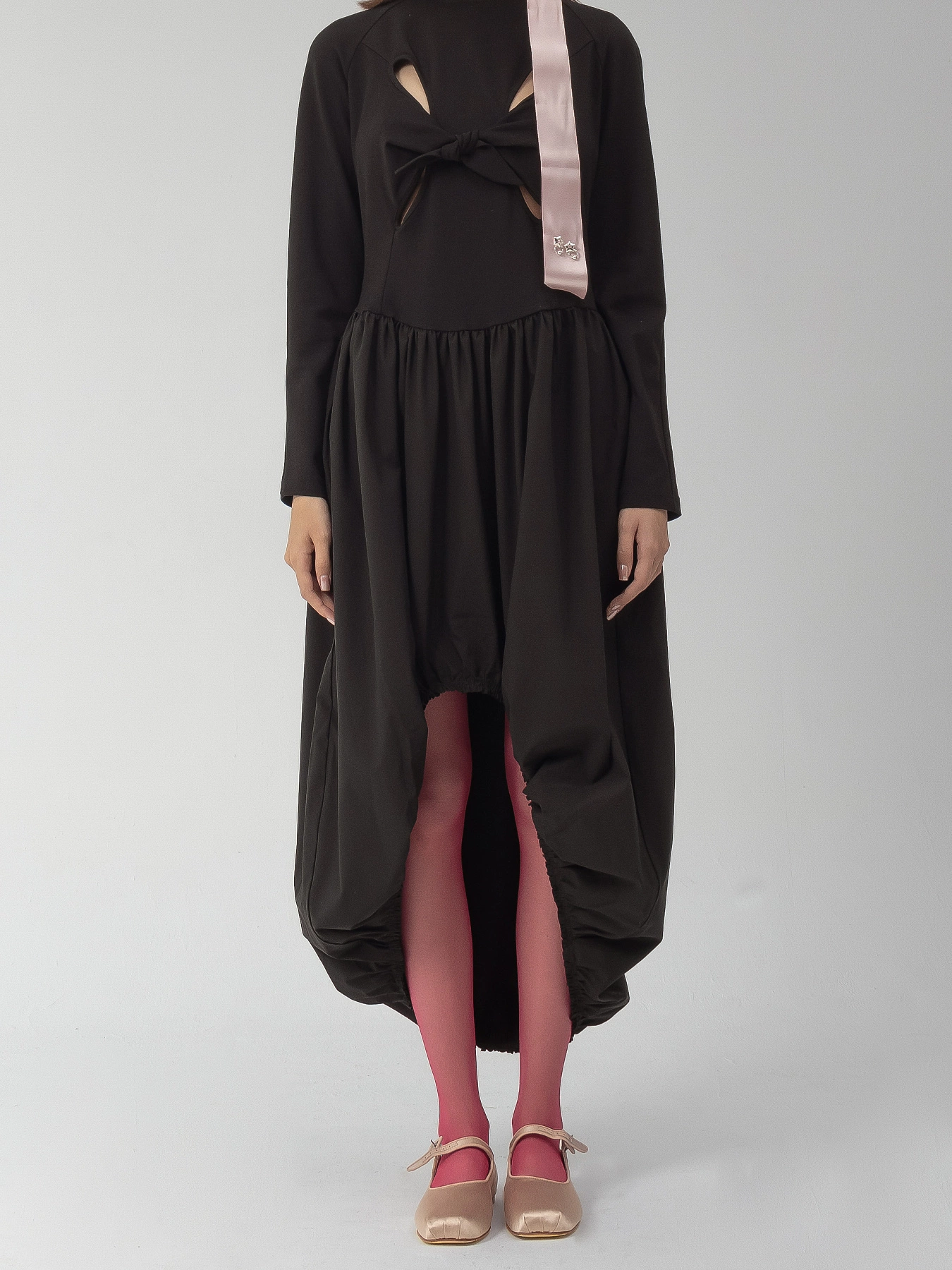 Concealed zip closure at back. Cutout with self-tie fastening at chest.