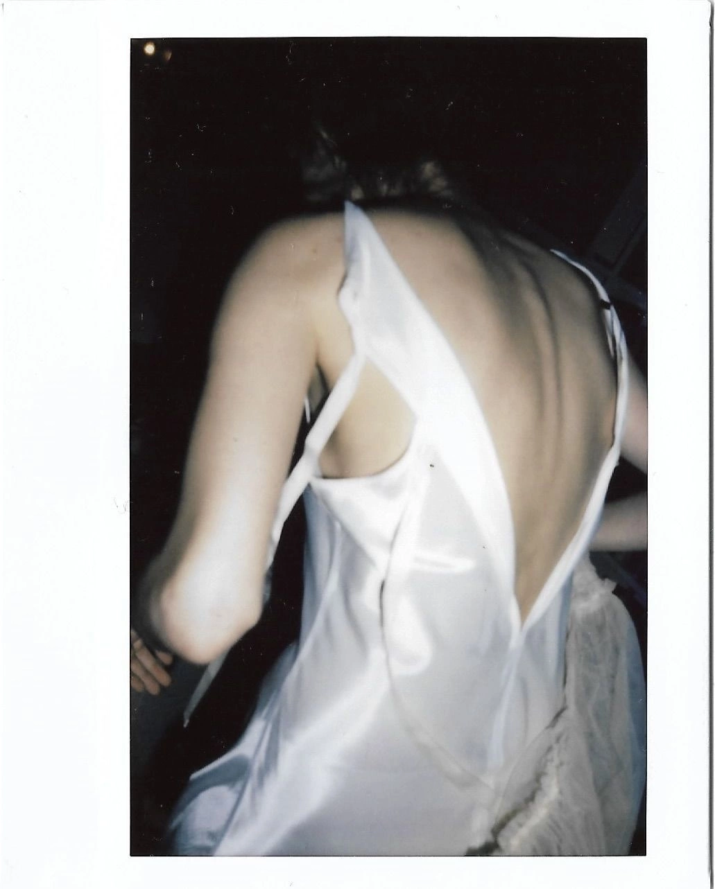Acetate satin dress with self-tie straps at open back. Unlined. Ideal pairs with Cherine dress.