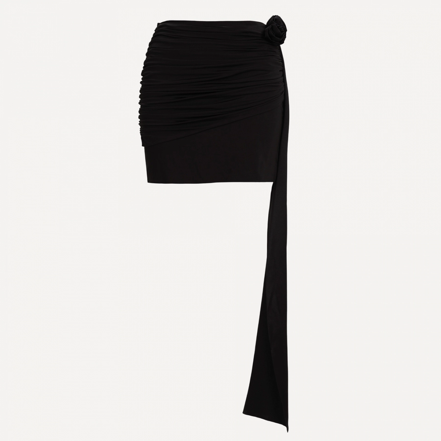 LOUIS SHENGTAO CHEN Black Twisted Jersey Mini Skirt with Rose Ribbon
