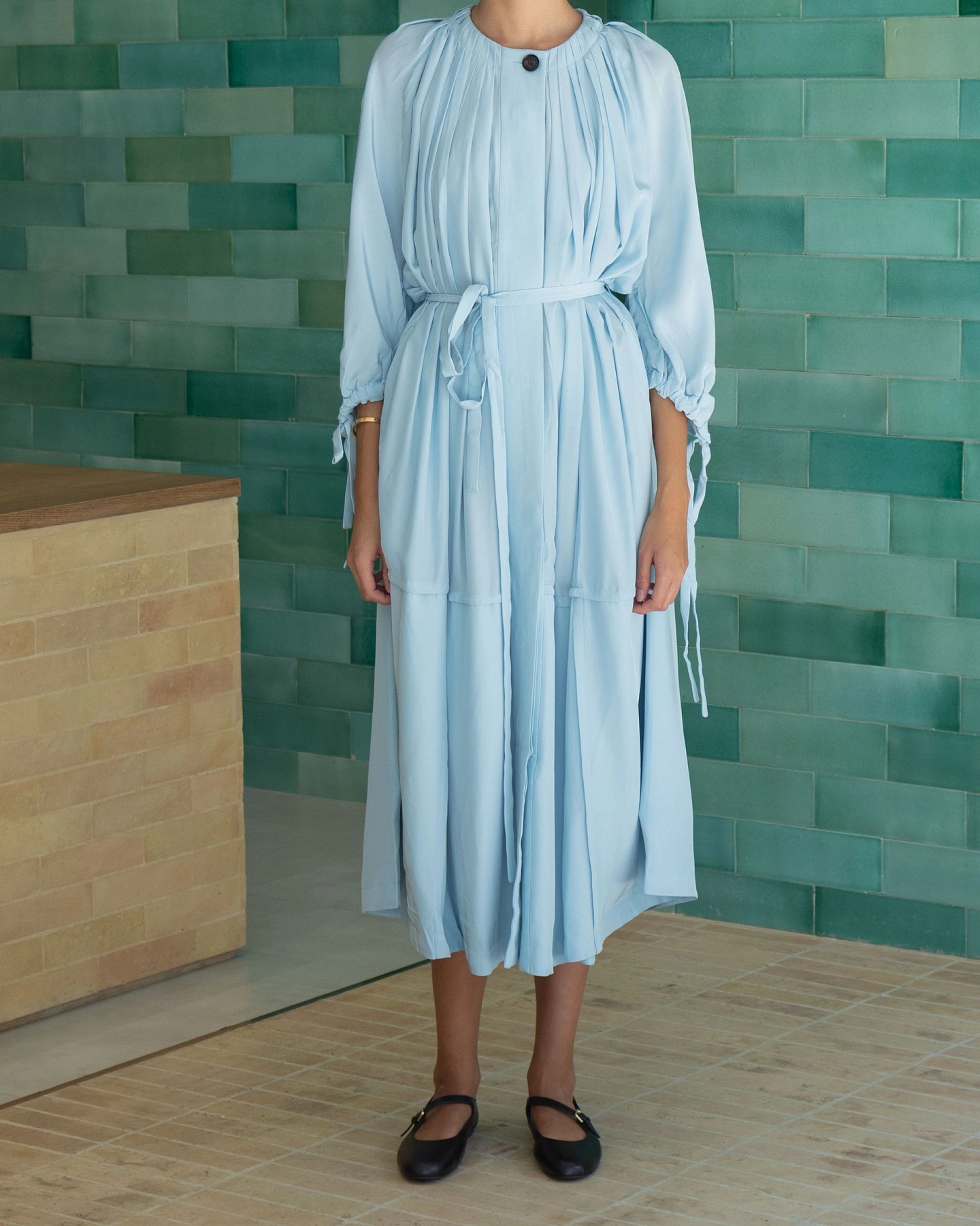 A silky viscose blouson dress that lays close to the body. Featuring generous box pleats self ties at sleeve, and a placket with hidden horn buttons that goes all the way down to hem. Bright blue color makes it a great choice for celebrations.