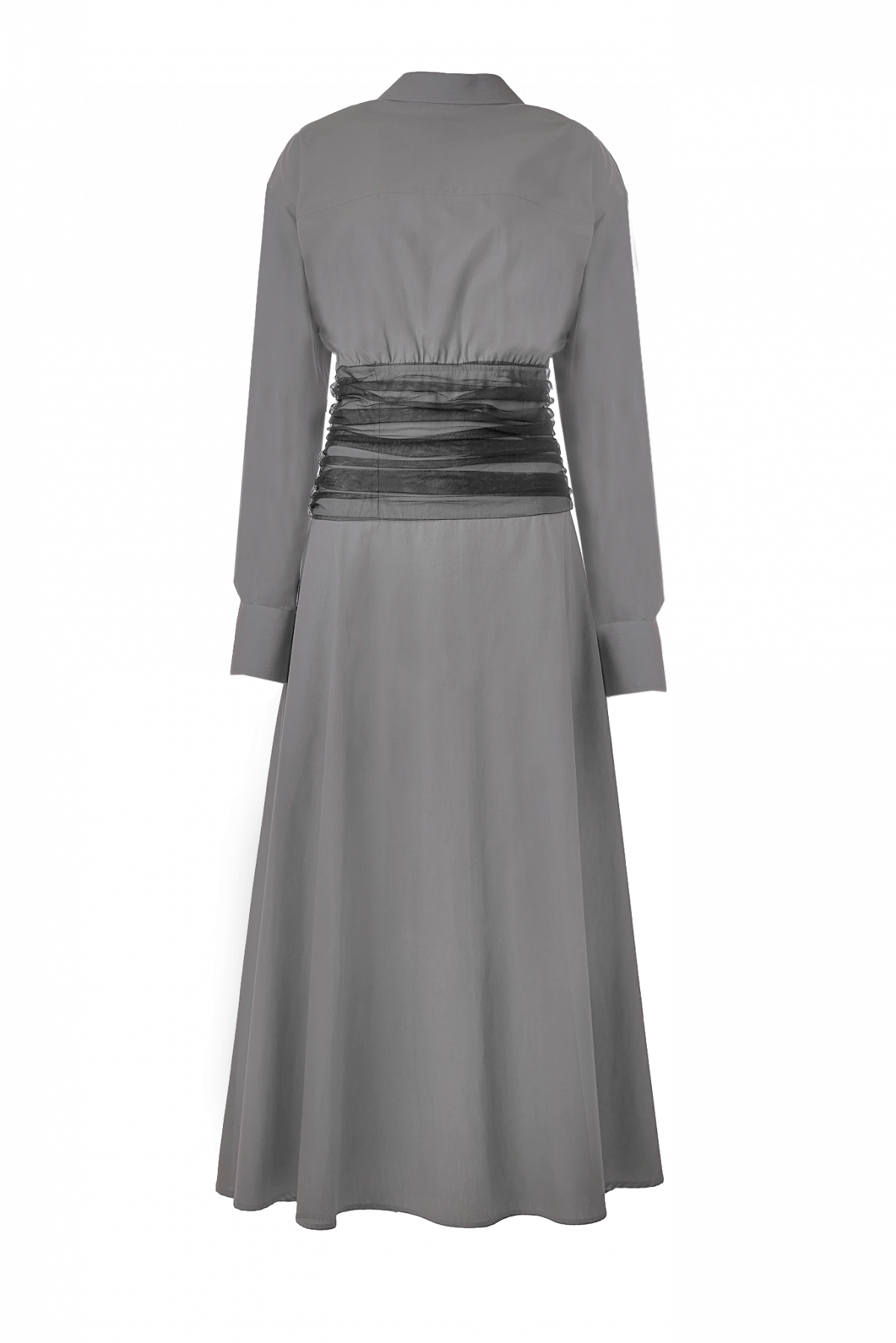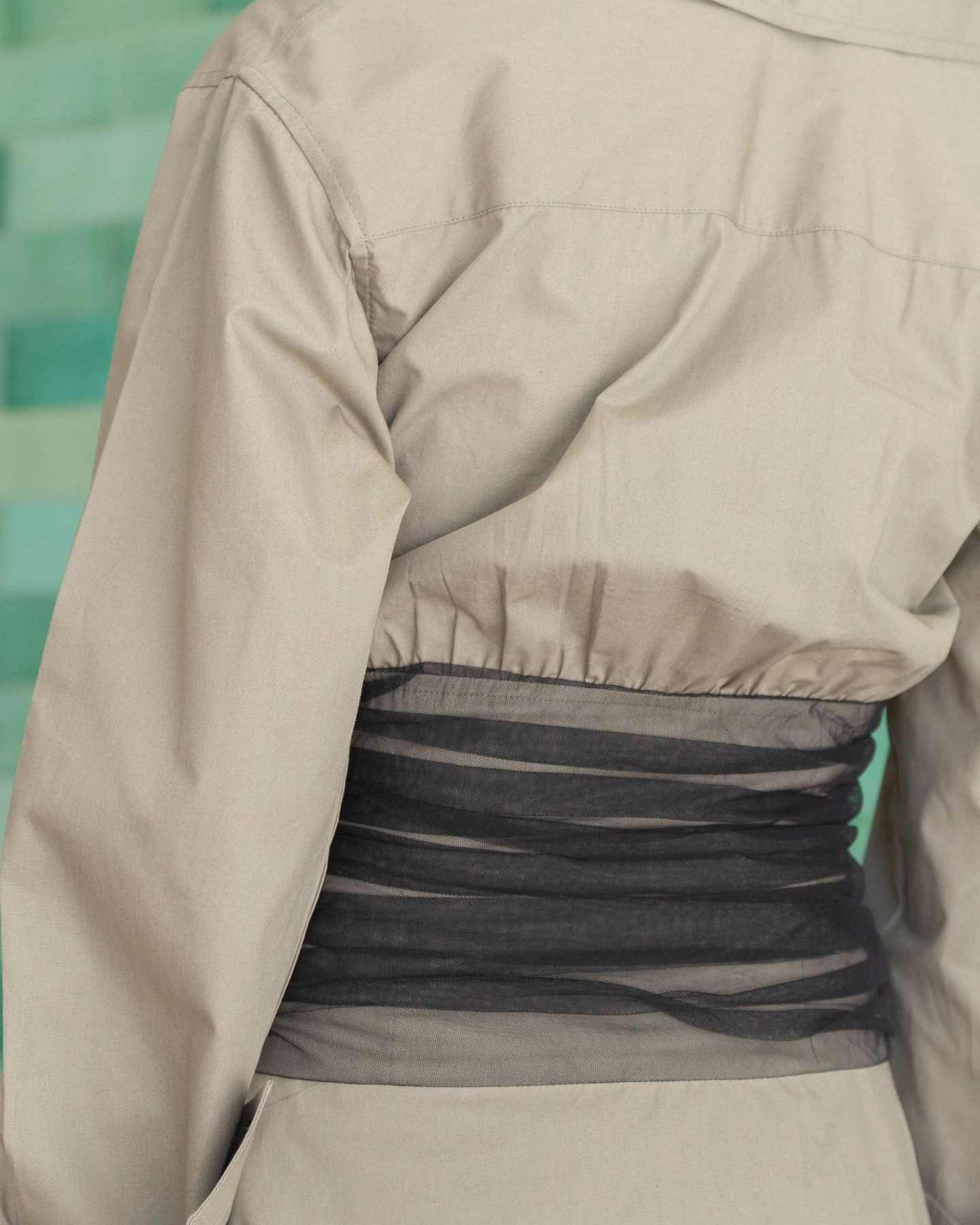 Timelessly elegant and immaculately tailored, this poplin shirtdress exudes modern romance with a gathered panel of dark tulle detailing the waist.