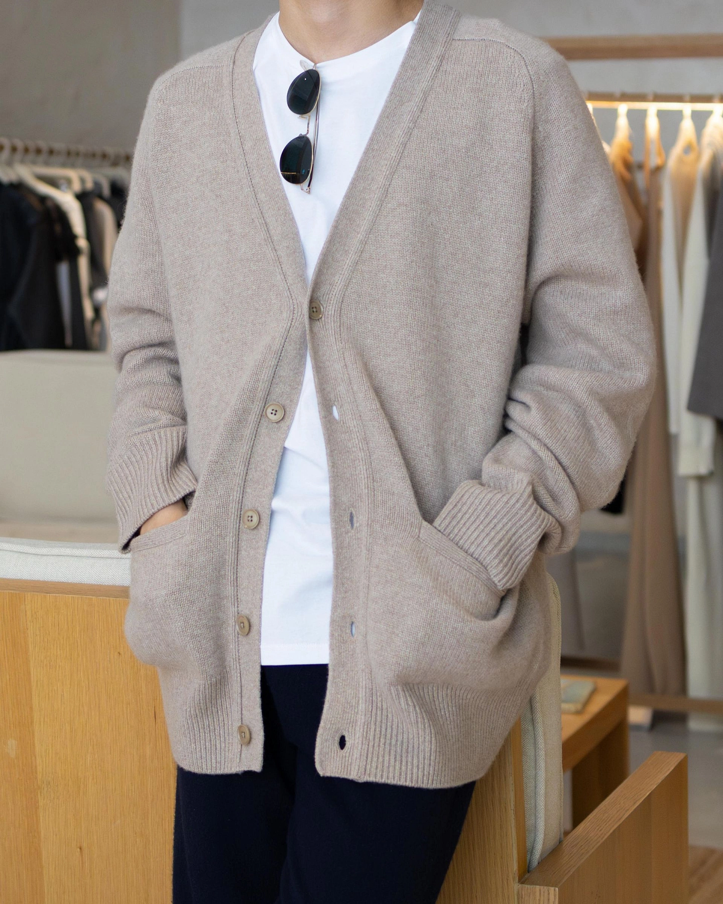 This classic cashmere v-neck cardigan is the perfect grandfather style with its comfort fit. The heavy-knit 'papilli' has an extra button on the side, which allows you to play with the fit of the cardigan. The cuffs and hem are rib knitted. Suitable for xs – xl bodies. Unisex.