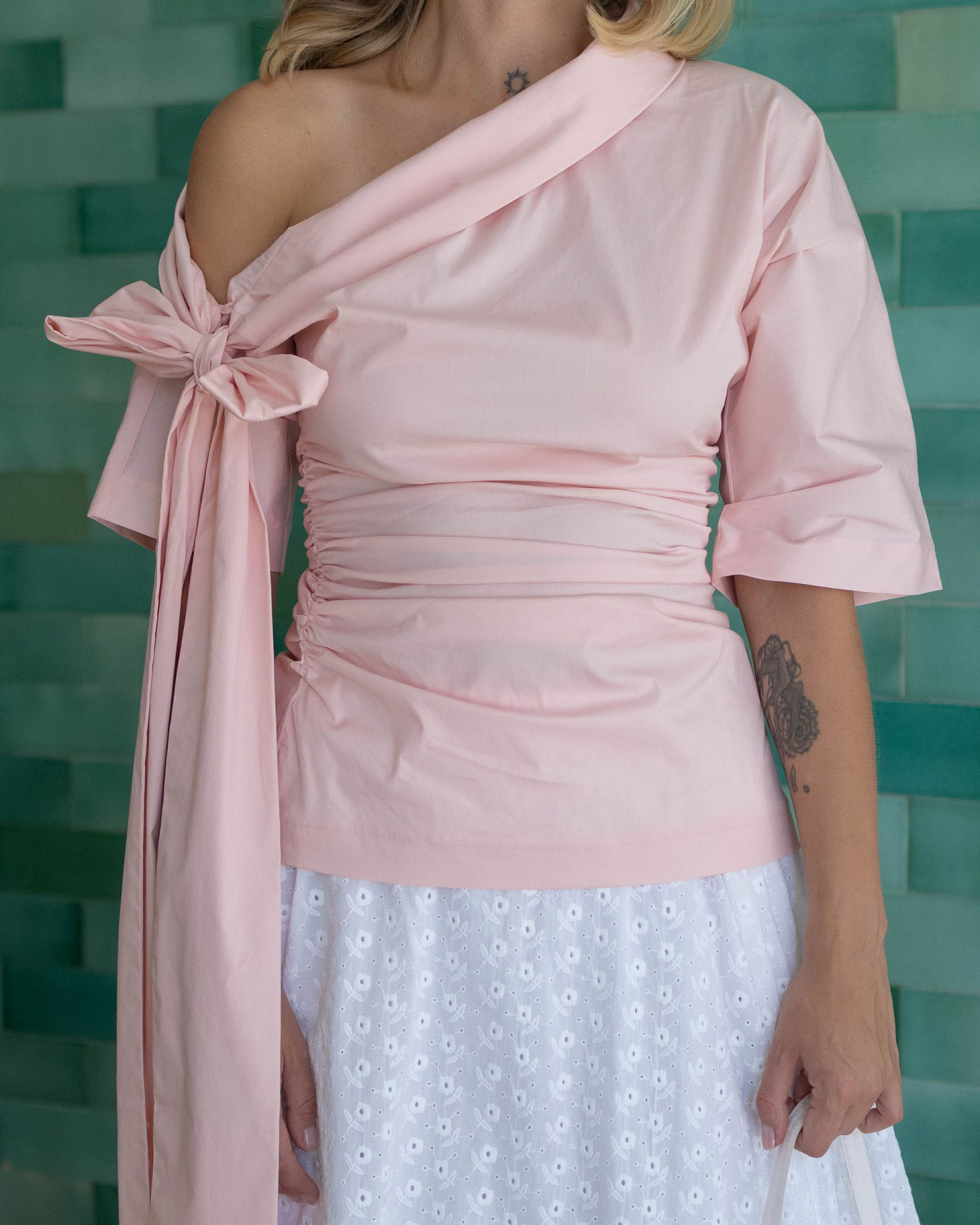 Bowie top: a versatile must-have for any wardrobe. With its accentuated waistline, elegant shoulder, and signature bow detail, this chic top effortlessly transitions from day to night. Available in blush pink, it's the perfect piece to elevate any outfit with style and sophistication.