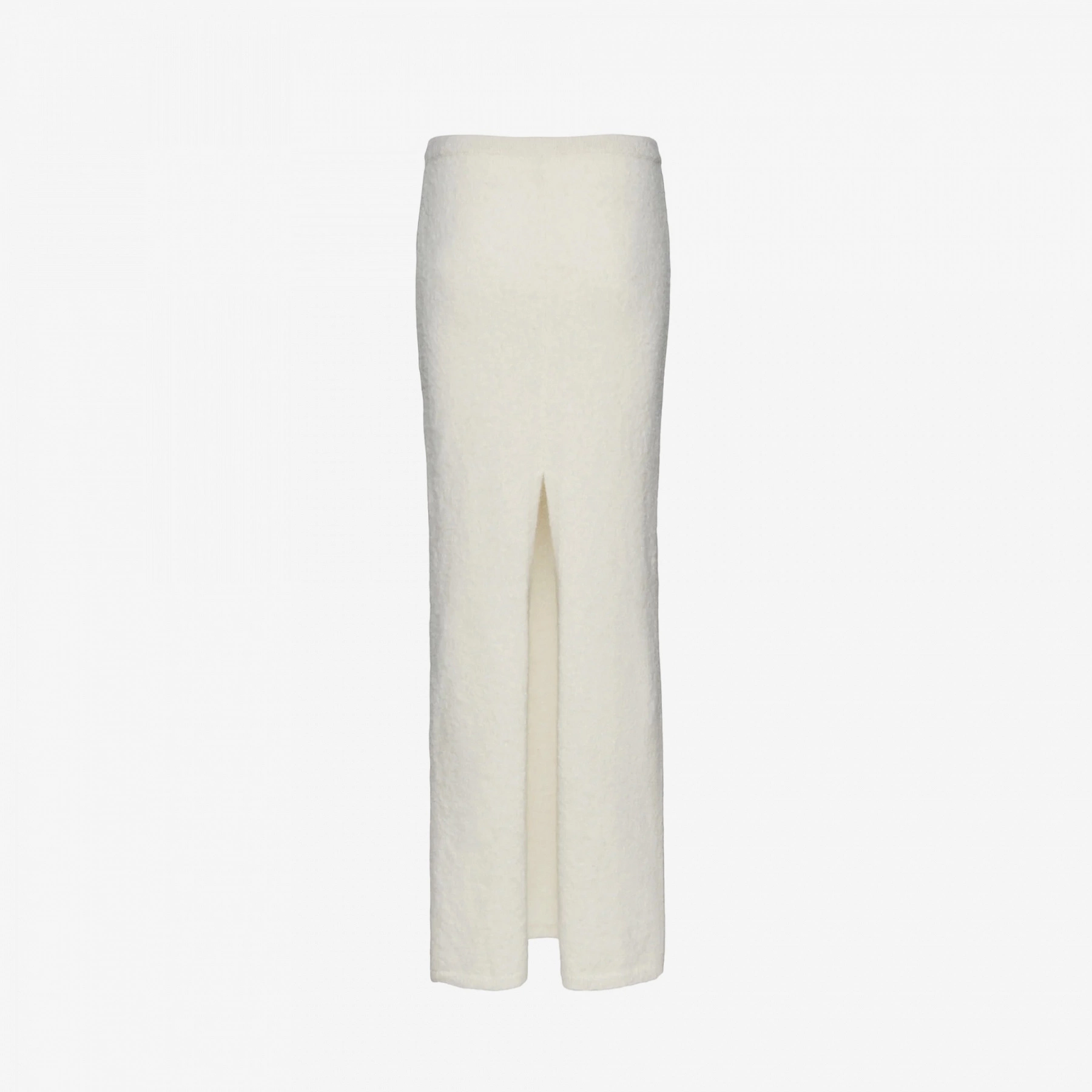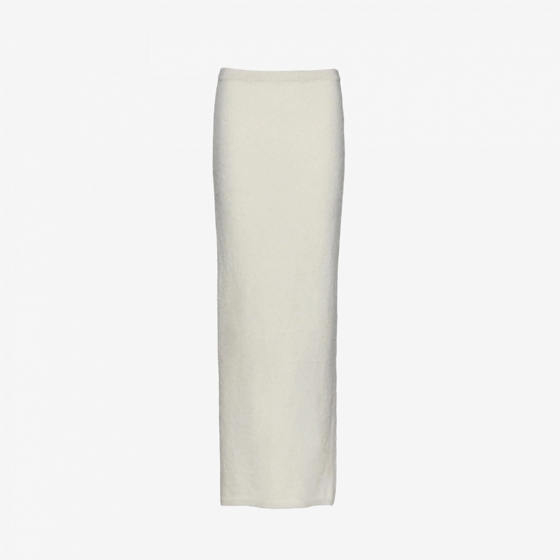 MADGA BUTRYM mohair blend knit maxi skirt in cream of mohair and alpaca, epitomizes understated elegance. Designed with a straight fit, it gracefully drapes to the ankle, creating a streamlined and minimalist silhouette. Combine with KNITWEAR 05 CARDIGAN cardigan and KNITWEAR 06 TOP.